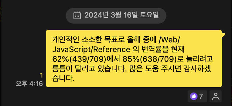 얼마전에 MDN 번역 레포에 기여한 PR이 대충 200개가 되었다. 정확한 수치는 모르지만 느낌상 기존에 번역 안됐던 문서는 대충 200개 이상, 그 만한 숫자의 문서를 최신화했을 것이다.